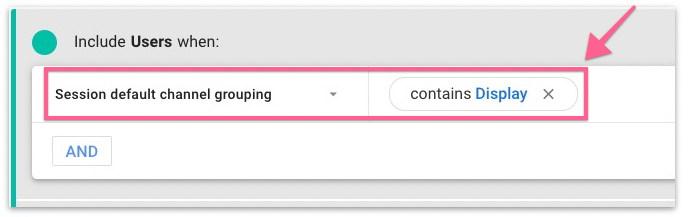 If you want to create a segment (report) for DISPLAY ADS traffic, select “Session Default Channel Grouping” from the condition filter and set the value to Contain “Display”.