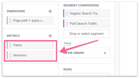 Next, add the metrics we want to see by clicking the “+” beside METRICS. Search for “Views” and “Sessions” and select them, then click “Import”.