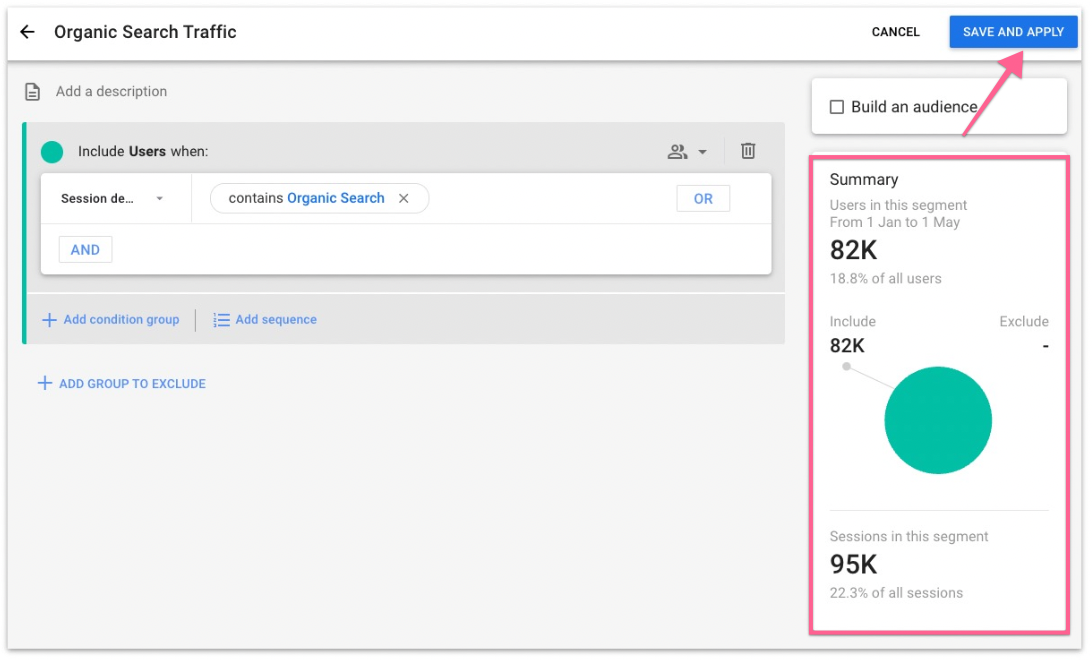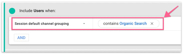 Search for the condition Session default channel grouping, set the filter to contains, and set the value to Organic Search. Then click “Apply”.