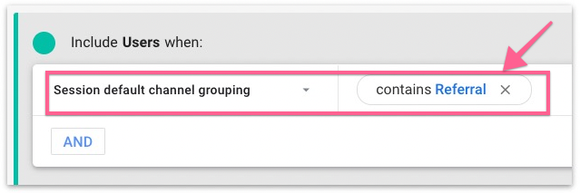 If you want to create a segment (report) for REFERRAL traffic (from other websites), select “Session Default Channel Grouping” from the condition filter and set the value to Contain “Referral”.