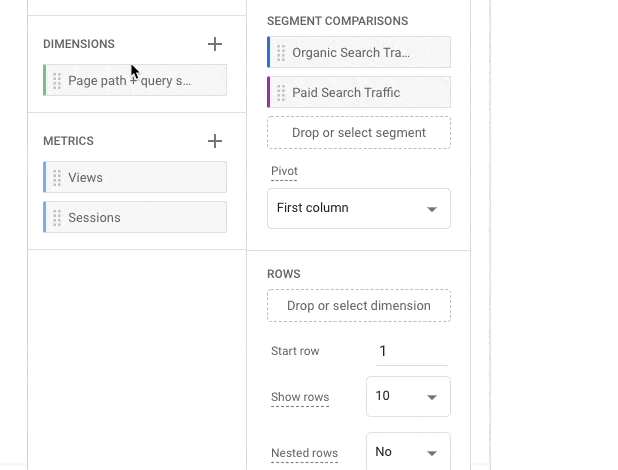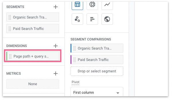 Note: The dimensions you pick will determine how your data will be broken down in your report. In this document, we will create a report broken down by page and organized by organic and paid search. By selecting Page path + query string, we’re breaking down the report by path and query string.