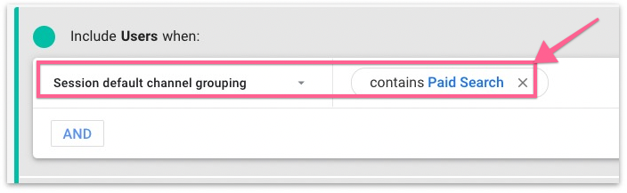 If you want to create a segment (report) for PAID SEARCH, select “Session Default Channel Grouping” from the condition filter and set the value to Contain “Paid Search”.