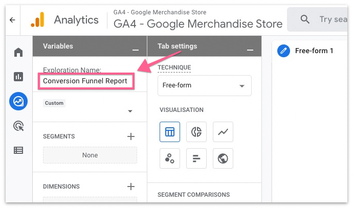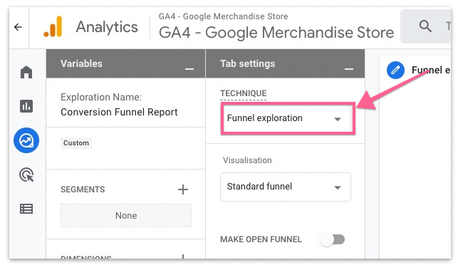 In the Tab settings, click on the drop-down menu under technique and select “Funnel exploration”.