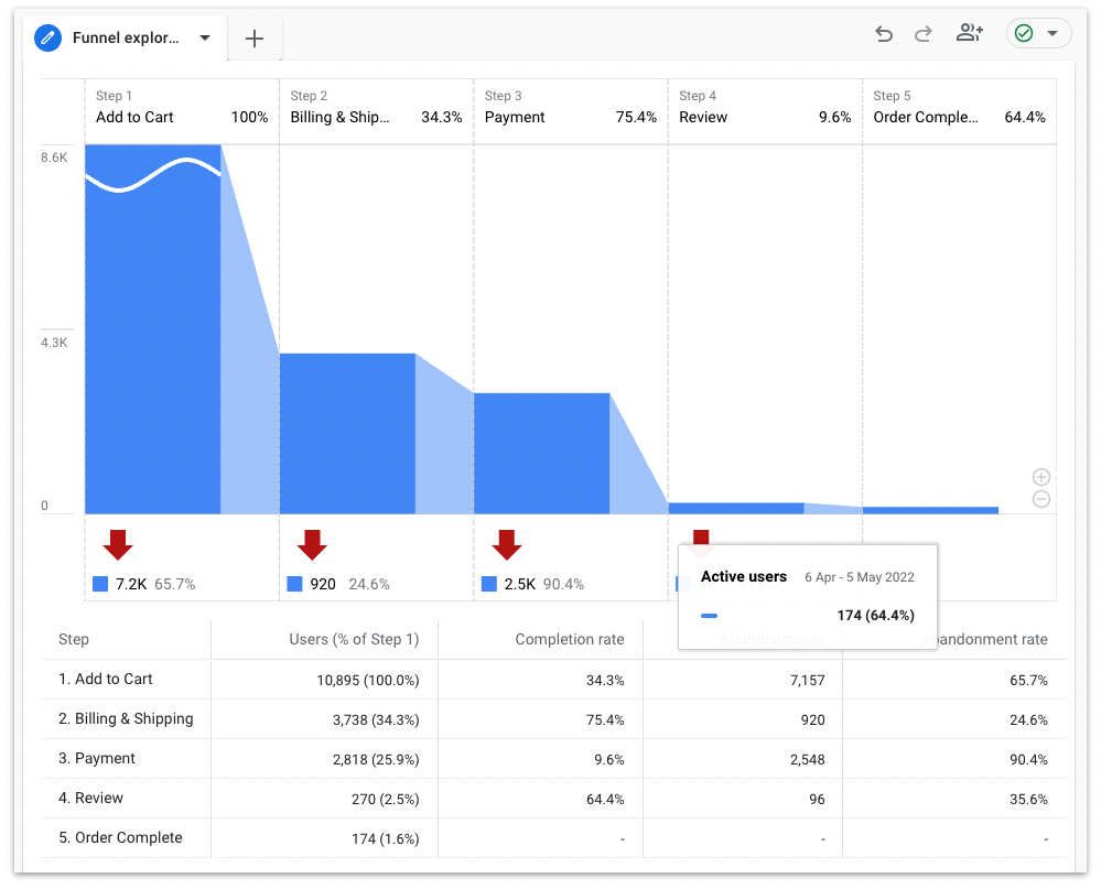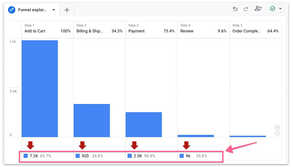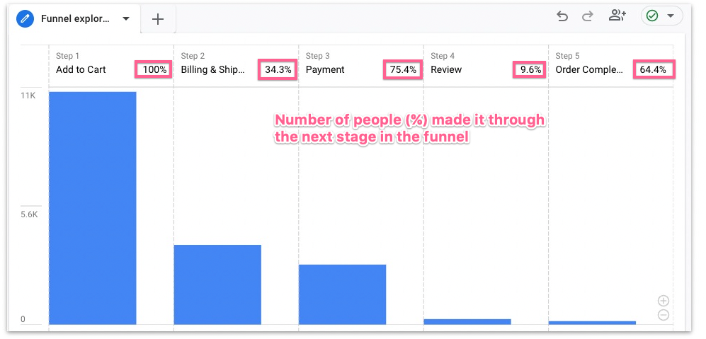 At the top of the chart, you’ll see the percentage of users who made it though the next stage in the funnel.