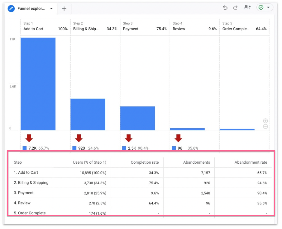 Lastly, you can see the numbers breakdown in table form for the entire funnel where you can see the completion rate, abandonments, and abandonments rate at each step of the funnel.