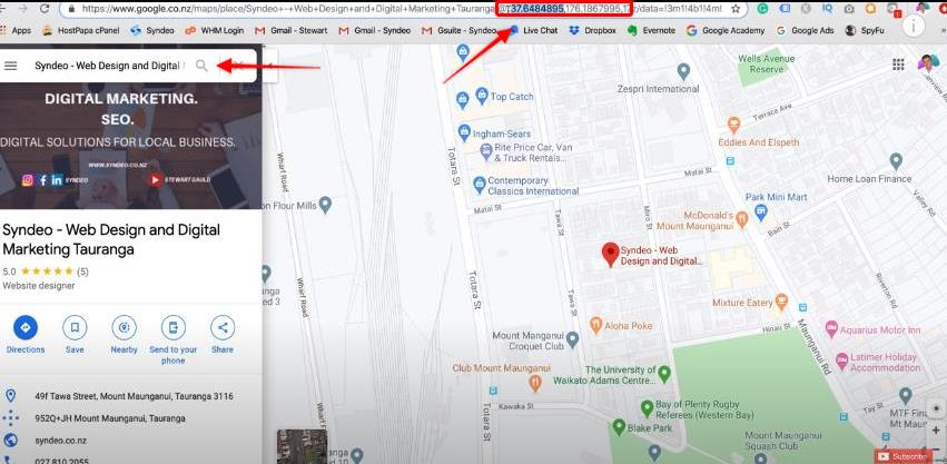 To get your business coordinates, go to Google Maps and type in your business name. Copy your latitude and longitude business coordinates in the search bar.