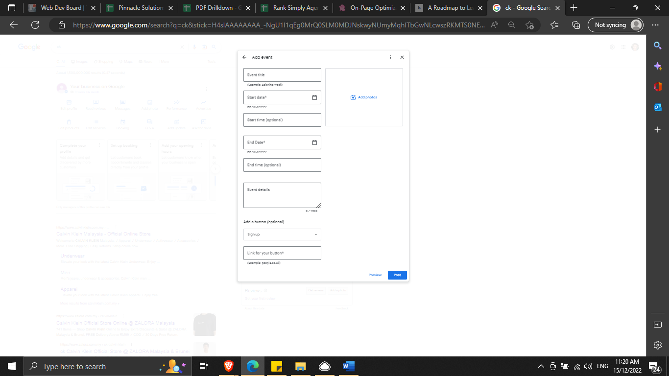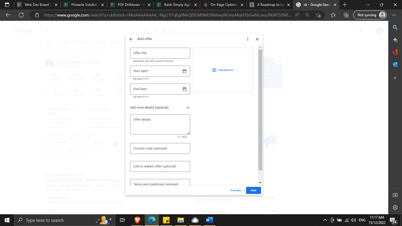 [Add Offer] / [Add Event] Adding an offer or event to your Google Business Profile will require more information such as an attractive title, start and end date/time, update details, and optimized offer photos or videos. For offers, you may add on a voucher code, terms and conditions, and a link to redeem the offer.