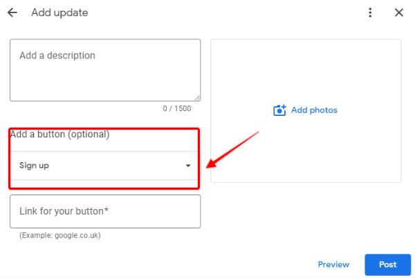 [Add Update] You will have to include an updated description and optimized images/videos about the update. Although adding a call-to-action button is optional, we recommend selecting either “call”, “book online”, or “sign up”. This will require a link or phone contact number that is currently available.