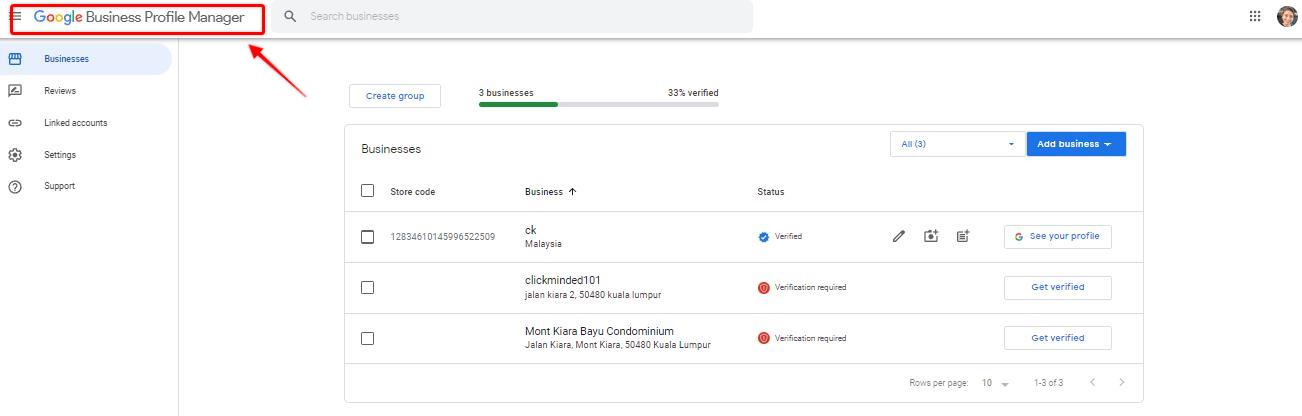 Ensure that you are on the right page labeled as “Google Business Profile Manager” and not your personal “Google Account”.