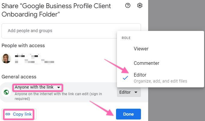Go to “General access” and change access to “Anyone with the link”. Make sure to click “Editor” for your client to organize, add, and edit files in the folder. Copy the shared link by clicking on the “Copy link” at the bottom of the pop-up.