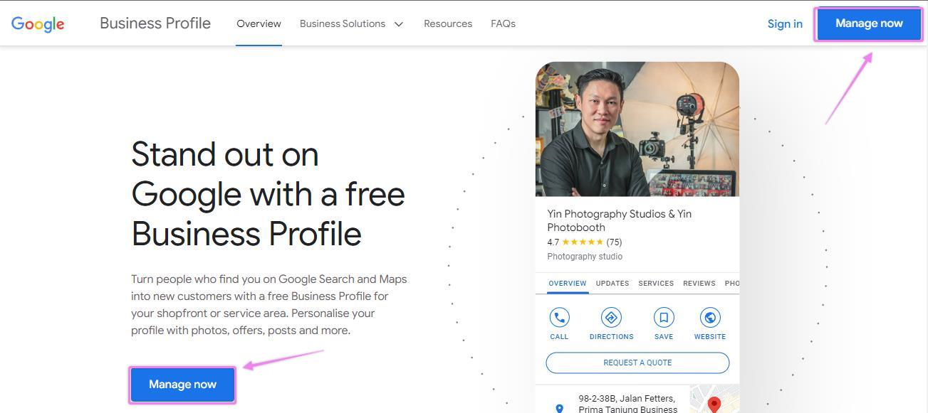 Visit the Google Business Profile site and click “Manage now”.