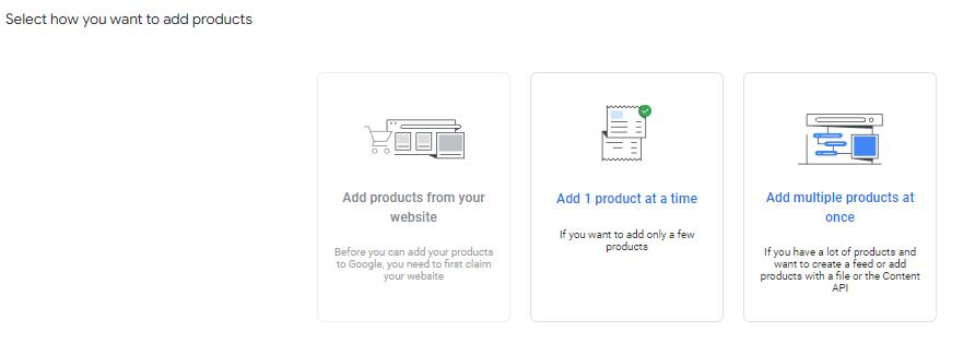 To add your products to your Google Merchant Center, you will have 2 different options as seen below. Depending on the number of product items, you may choose either one to proceed.