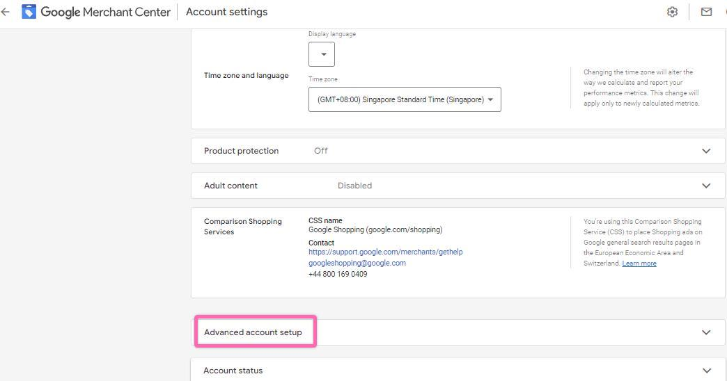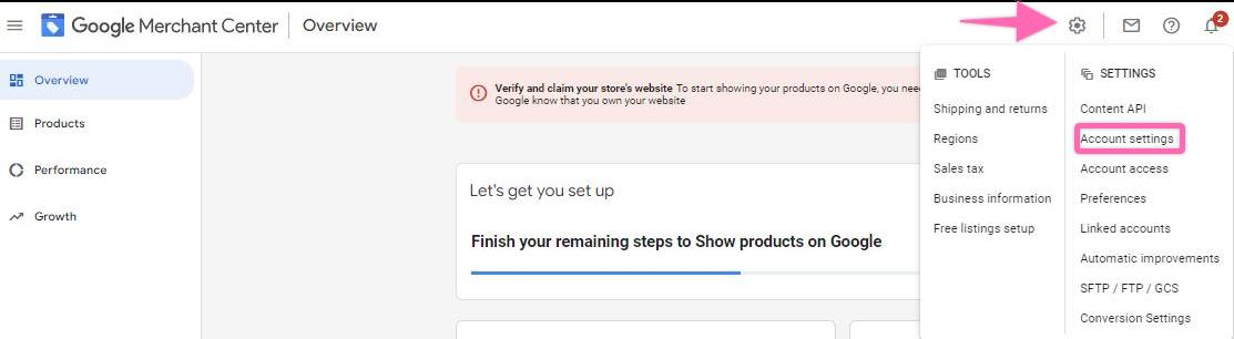 On your Google Merchant Center overview page, click the setting menu icon [Gear] and then Account settings.