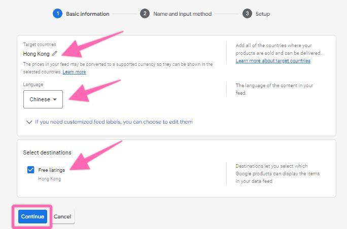 To add multiple products, you will be requested to input basic information, name, input method, and setup. Click on target countries (pencil icon), and language (drop-down box), and select free listings destination. Hit “Continue”.