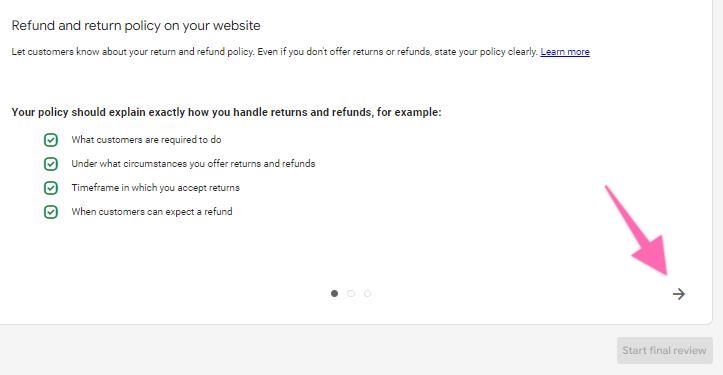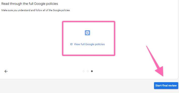 Next, you will be requested to click on “View full Google policies”. We recommend going through it as much as possible to avoid disapproved product listings and ads in the future. Click “Start final review” once you have read the Google policies.