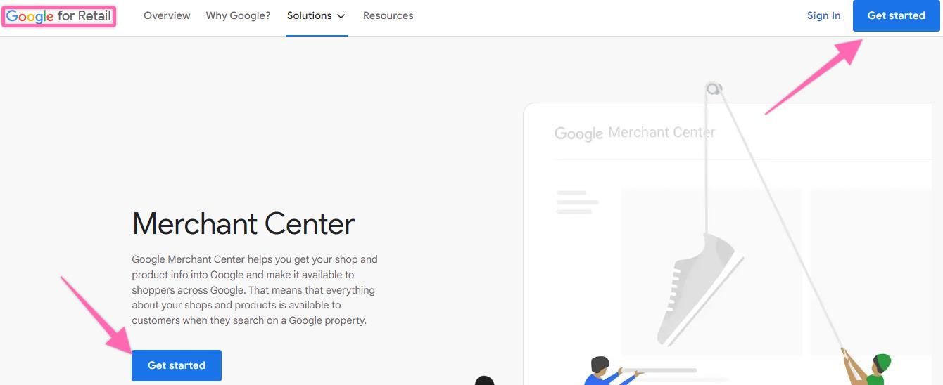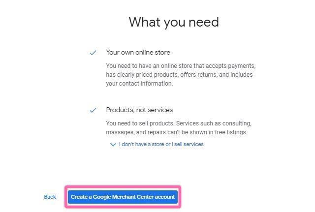 On the next page, scroll down and click “Create a Google Merchant Center account”.