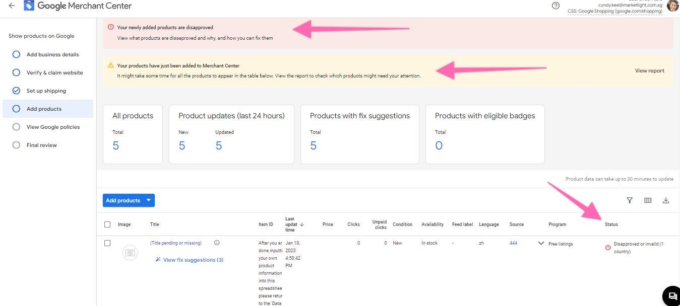 vii. Next, you will be directed to a product overview page as shown below. You will be able to see all product listings and their statuses. Any disapproved products or add new products status to the list will be prompted at the top.