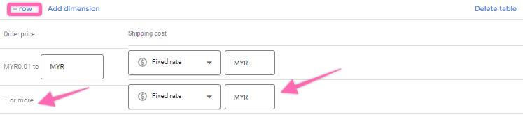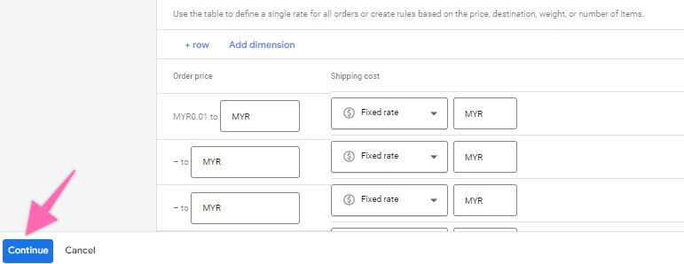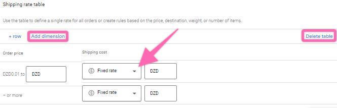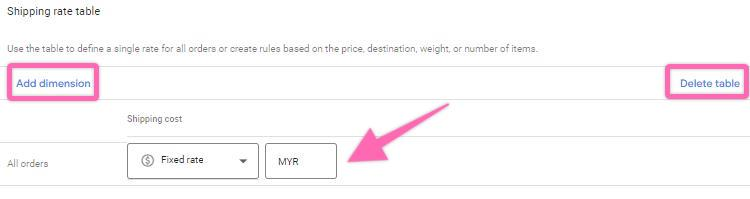 d. To “create a single rate for all orders”, adjust your shipping cost and currency. Remember to click “Add dimension” at the top.