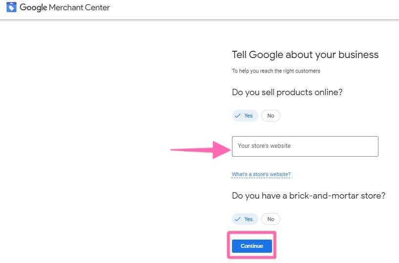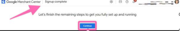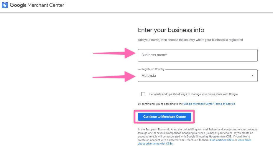 Next, enter your business name and registered country. Click “Continue” to Merchant Center”.