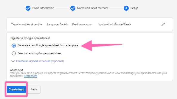 ii. Next, it is recommended to click “Generate a new google spreadsheet” instead of “Select an existing Google spreadsheet” for new users. Click “Create Feed”.
