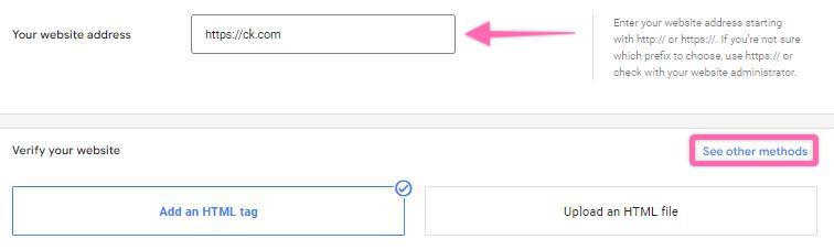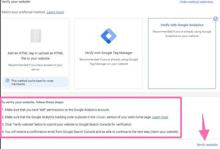 Once a method is chosen, scroll down and follow the recommended steps. Click “verify website” once you are done. The steps are depicted below.