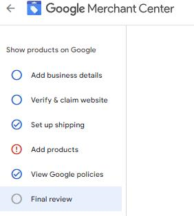 To review your progress, you may go to your Google Merchant Center setup page where you will be able to see which sections are not complete or facing issues in completion. An example is shown below.