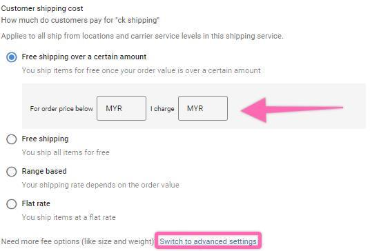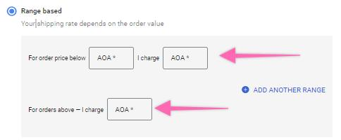 c. If your shipping cost is ranged-based, key in the order price below and above a certain price and how much you charge.
