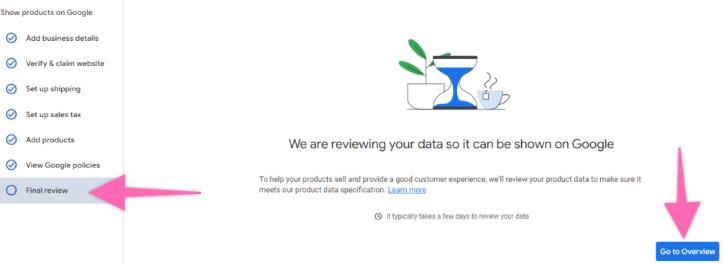 After you finish all the steps, go to “Final review” and select “Go to Overview”. Google will review your submitted business information and data. This will take approximately 12-24 hours.