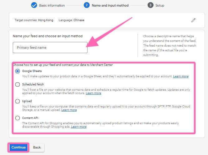 i. Name your primary feed and choose an input method before you hit “Continue”. We recommend choosing “Google Sheets”.