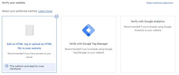 You can verify your store in 3 different methods. This includes “add/upload an HTML tag/file” or “with Google Tag Manager” or “Google Analytics”.