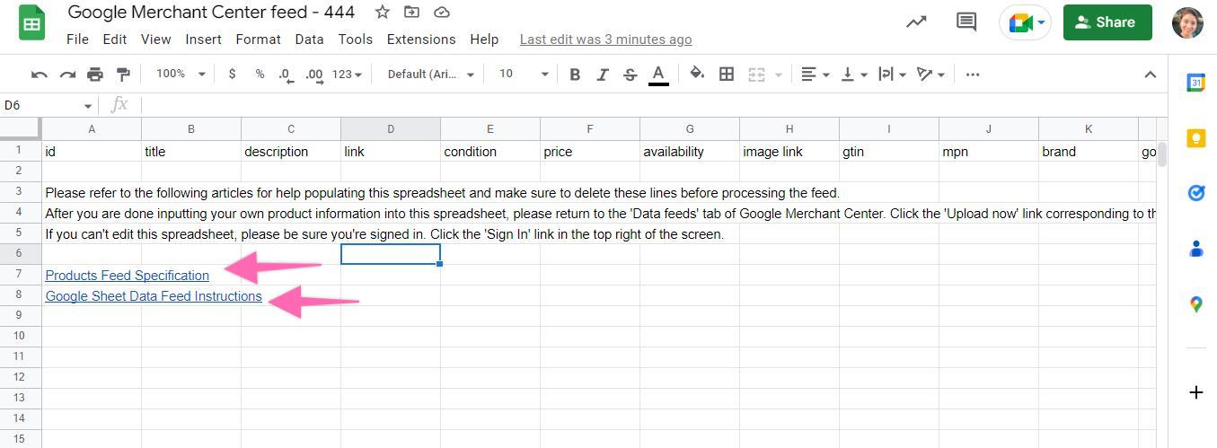 v. Add your product details as per the product feed specification and Google Sheets data feed instructions. You will have to go through the specifications and instructions to prevent any disapproved products to be fed into your Google Merchant Center.