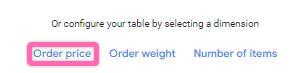 e. To “configure your table”, select a dimension. This can be “order price”, “order weight”, or by “number of items”. An example of how to add “order price” is depicted and explained in the following steps.
