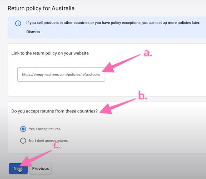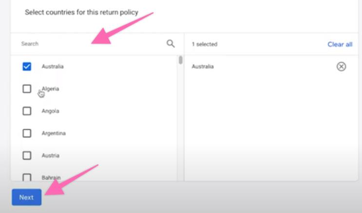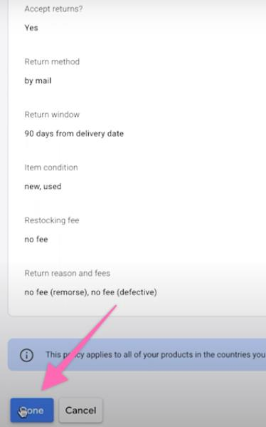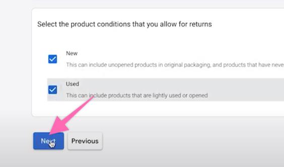 Select the type of product condition where you allow for returns. Click “Next” to proceed.
