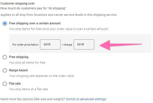 c. If your shipping cost is ranged-based, key in the order price below and above a certain price and how much you charge.