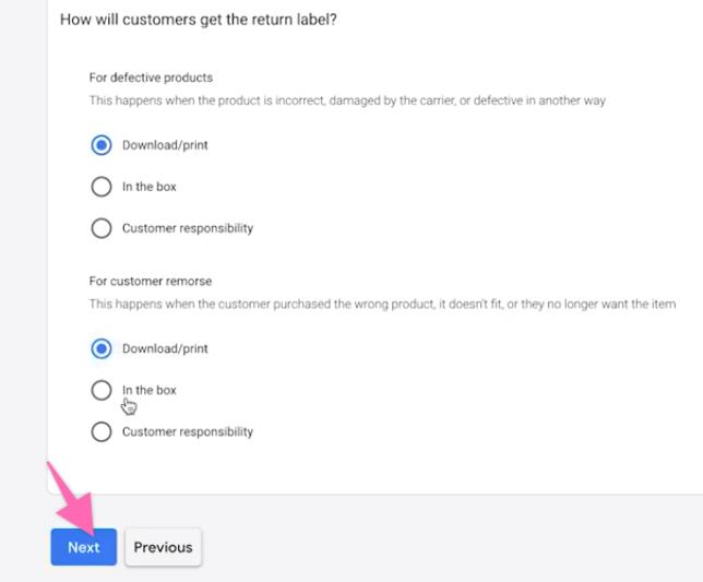 Select a method on how customers will get the return label. This depends on the type of product you are currently selling. Click “Next” to proceed.