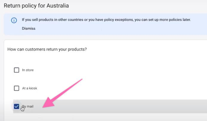 Select a method on how customers can return your products. Typically, this is done via mail for most merchants.
