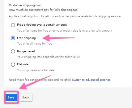 b. If your shipping cost is free, select “Free shipping” and click “Save”.