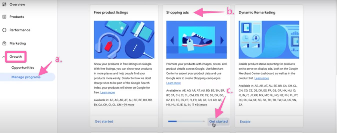 Next, you must set up and activate the shopping ads return policy in your Google Merchant Center. Return to the dashboard and click “Growth” on the left navigation menu.