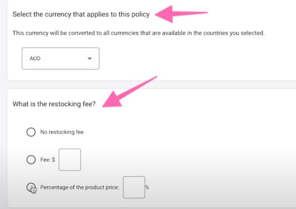 Next, select the currency that applies to this policy and input the cost or percentage of the product price if you have restocking fees.