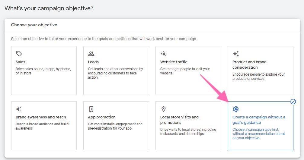 Next, select “Create a campaign without a goals guidance” when choosing your objective for the campaign.