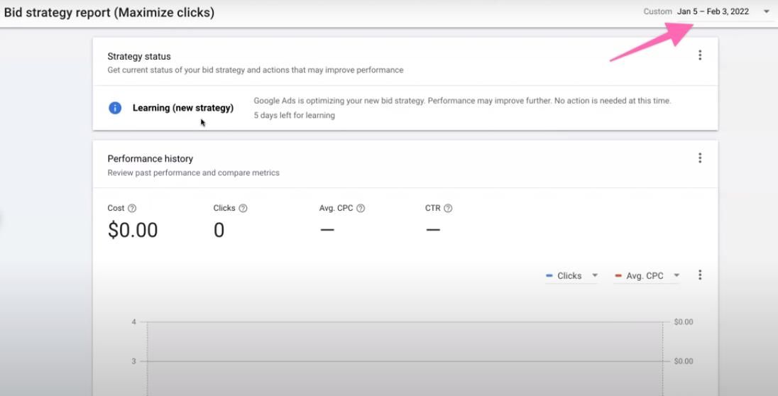 Hoover your mouse to the status name. You can “View bid strategy report” calculated by Google Ads. Make sure to change the date range on the right corner of the screen to view your bid strategy report accordingly.