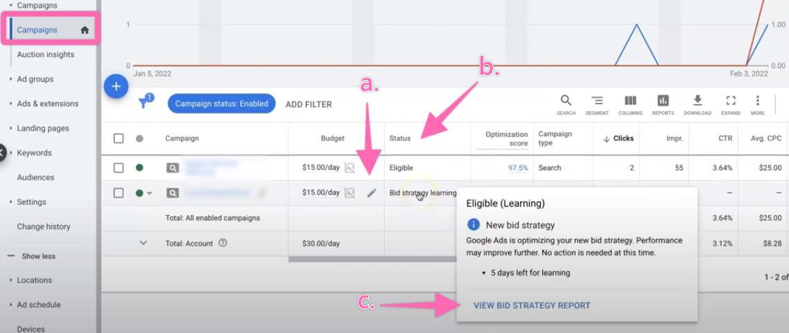 Lastly, you can view your bid strategy status under “Campaigns”.