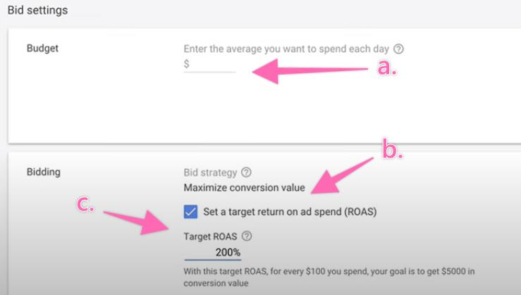 Target return on ad spend (ROAS): This alters your bids to get the best conversion value. With this option, you will set an average return on ad spend that you would like to achieve, and Google will work toward this goal.