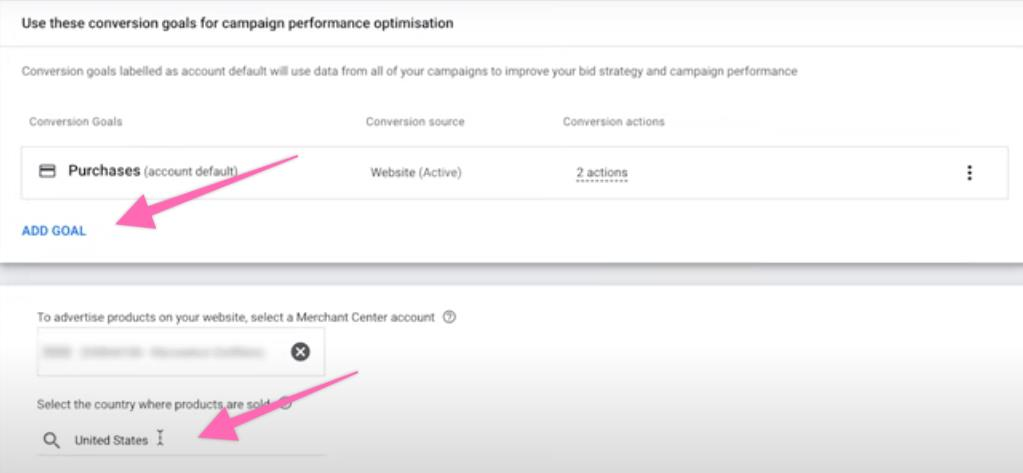 Next, set up your conversion goals by clicking “Add goal” and selecting the country where your products are sold, as seen below.