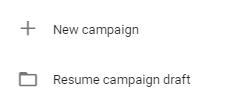 Next, if you are new, you will have to set up a new campaign. Click on the “+New campaign” button. A mini pop-up will appear where you can select “New campaign”. If you already have a new campaign set up halfway, proceed to select “Resume campaign draft”.