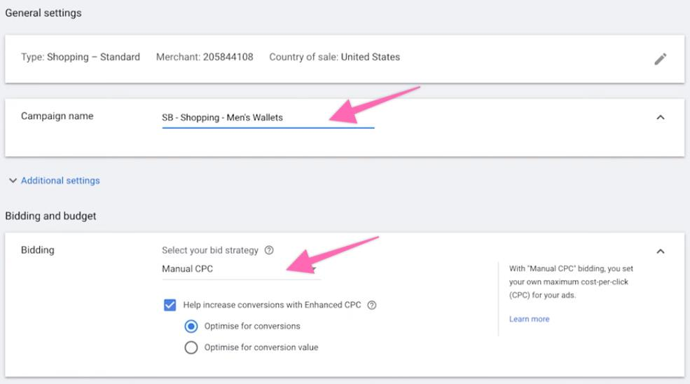 Following the steps in Where to set and edit bidding for your Google shopping campaign in Google Ads, choose “Standard shopping campaign” under the campaign subtype followed by “Bid settings”. Select “Manual CPC” under the drop-down menu. For Enhanced CPC, go to Strategy 6: Manual CPC (Enhanced)