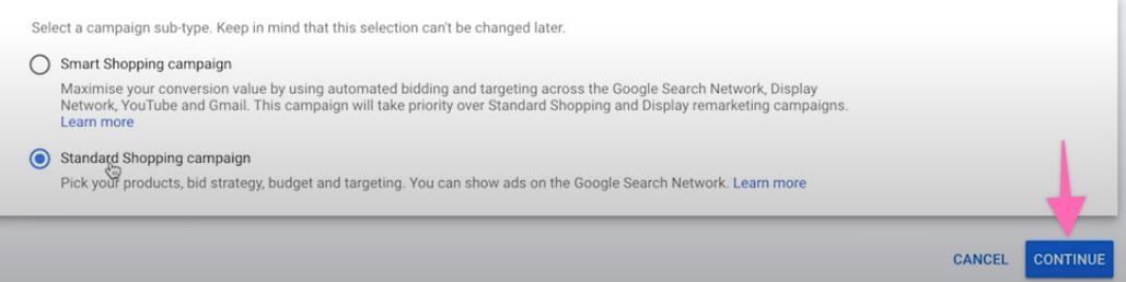 For new users, it is recommended to select “Smart Shopping campaign” for Google to automate your bidding strategy. For users who want to pick their own bid strategy, go for the “Standard shopping campaign”. Hit “Continue” to proceed.