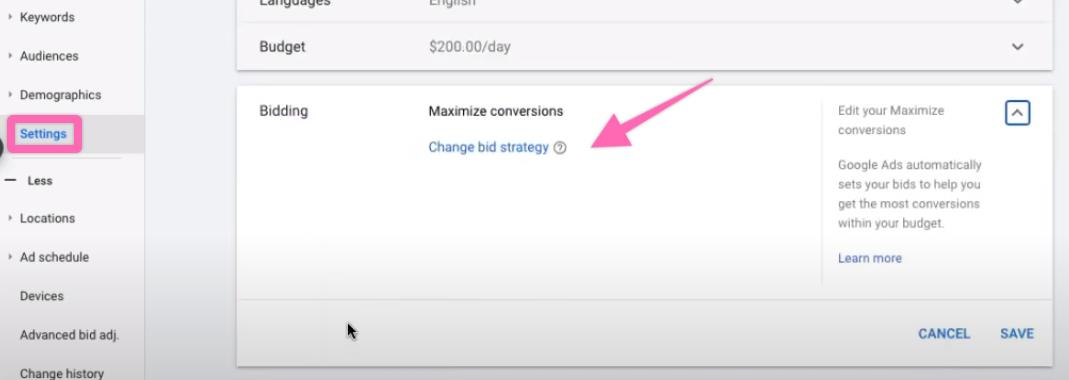 Next, go to “Settings” on the left, scroll down to the “Bidding” section on the right, and hit “Change bid strategy”.