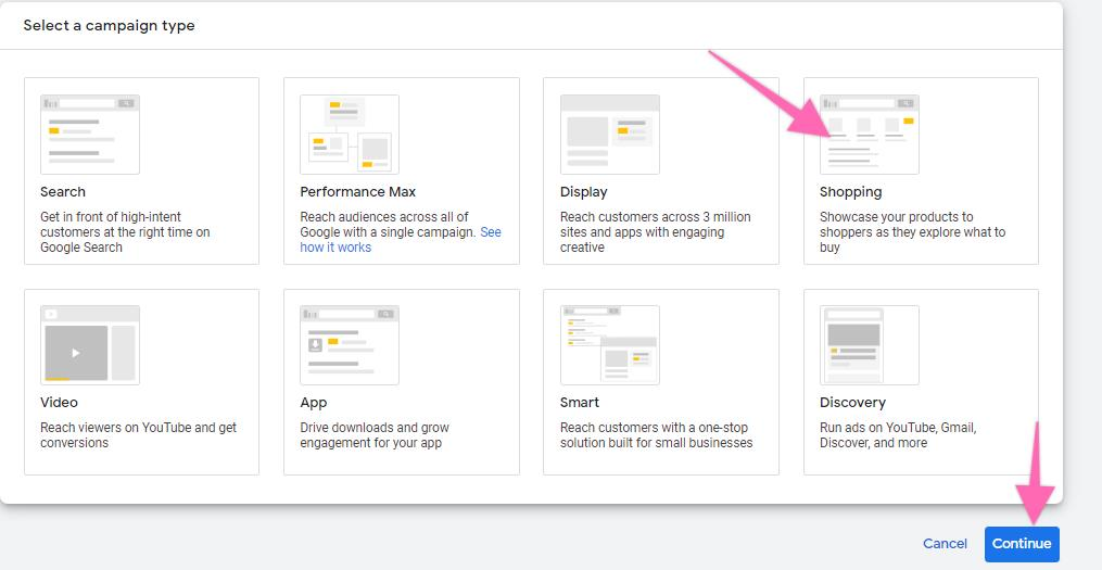 Select “Shopping” as your campaign type and hit “Continue”. At this stage, ensure that your Google Merchant Center has successfully linked to your Google Ads account.